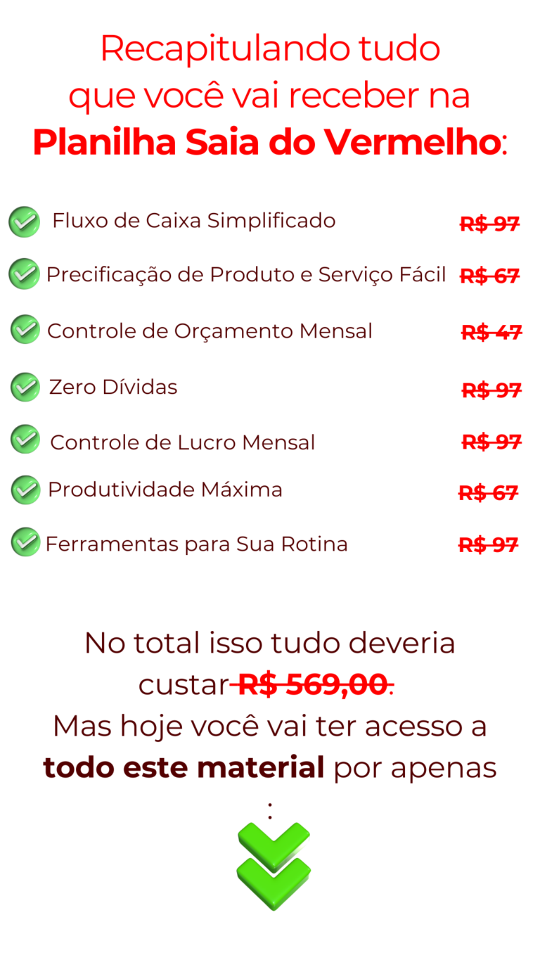 E para seguir estes passos, veja tudo que você vai receber na Planilha Saia do Vermelho para virar o jogo e ter lucro todos os meses.